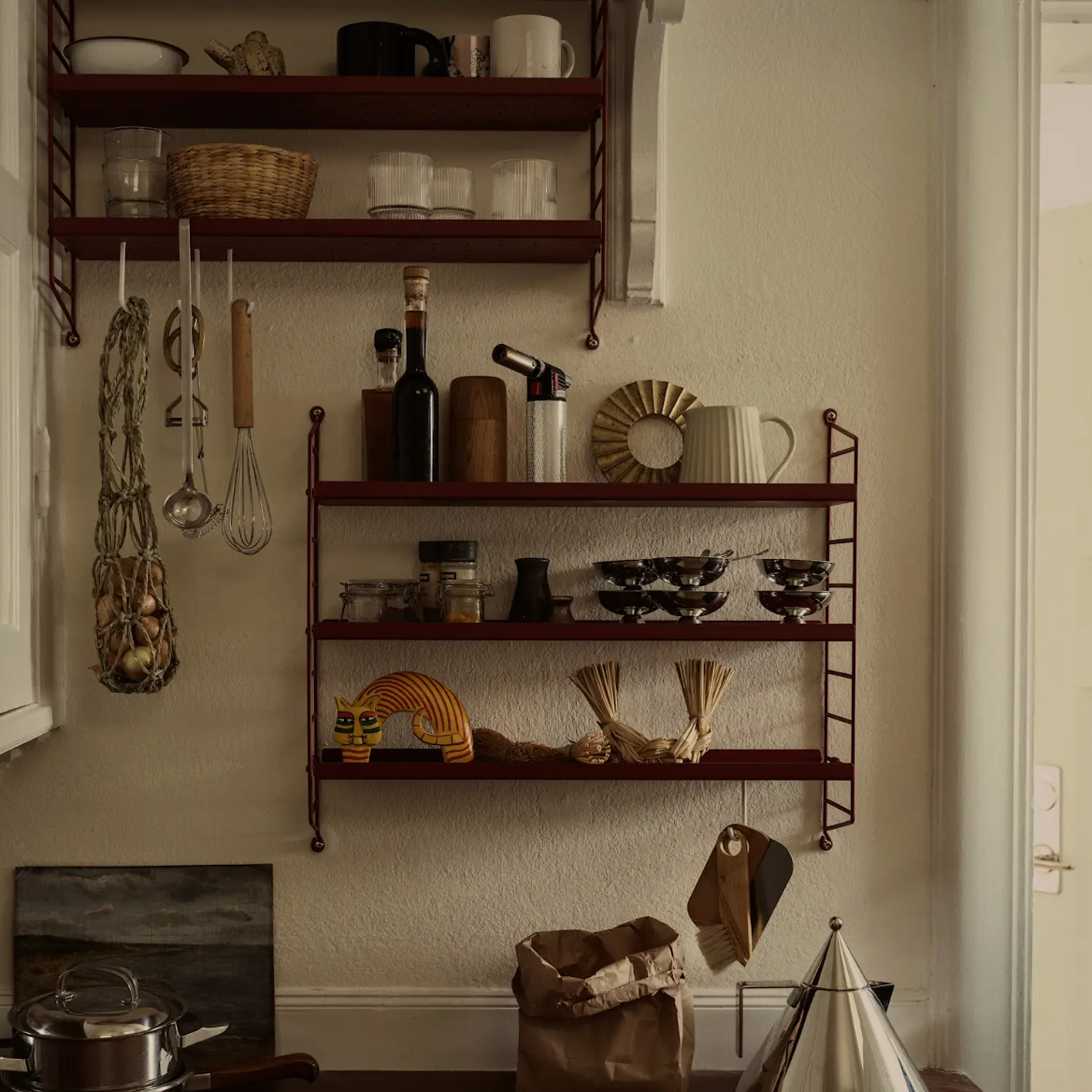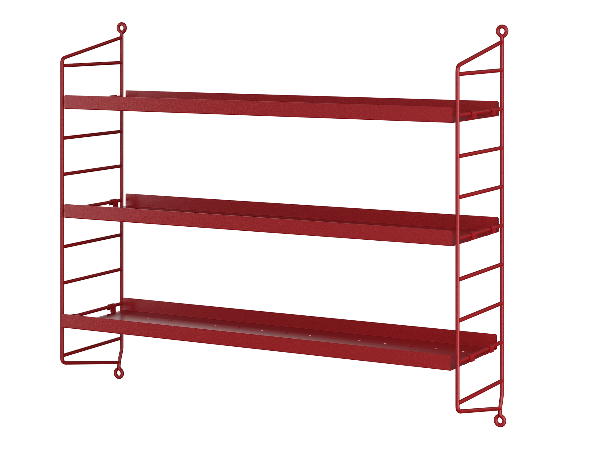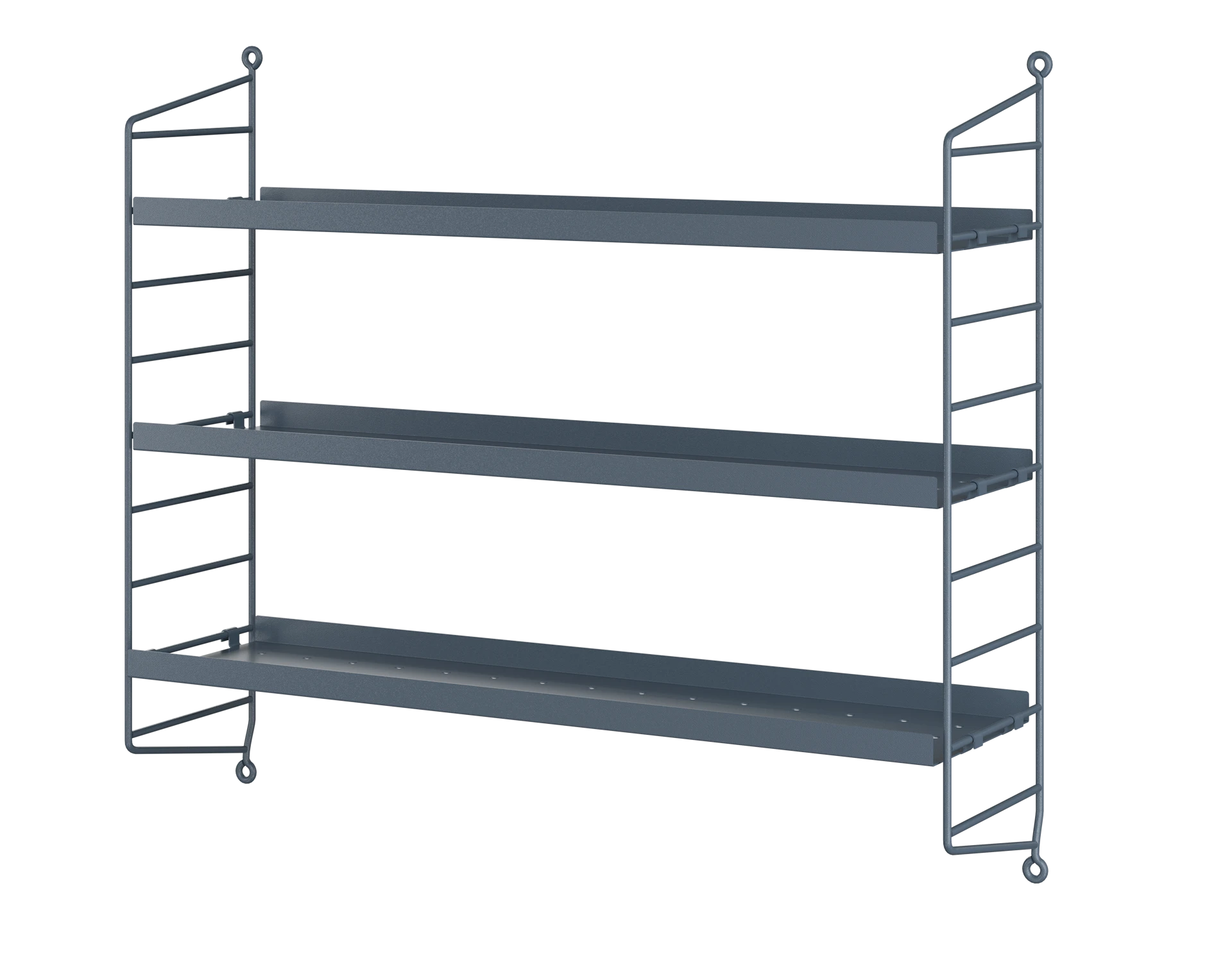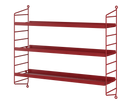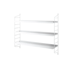 String® Pocket metal is sold as a complete shelf but is equally flexible as String® System. String® Pocket invites creativity and personality where you can combine two or three String® Pocket shelves into one larger shelf. Mix and match different colours to suit your style and preferences. The perforated metal shelves with low edge, 2 cm, makes it possible to add hooks and rods (30 cm and 58 cm) to increase the storage possibilities. String® Pocket metal is sold as one complete unit containing two wire panels, height 50 cm, and three metal shelves, width 58 cm and depth 15 cm.
