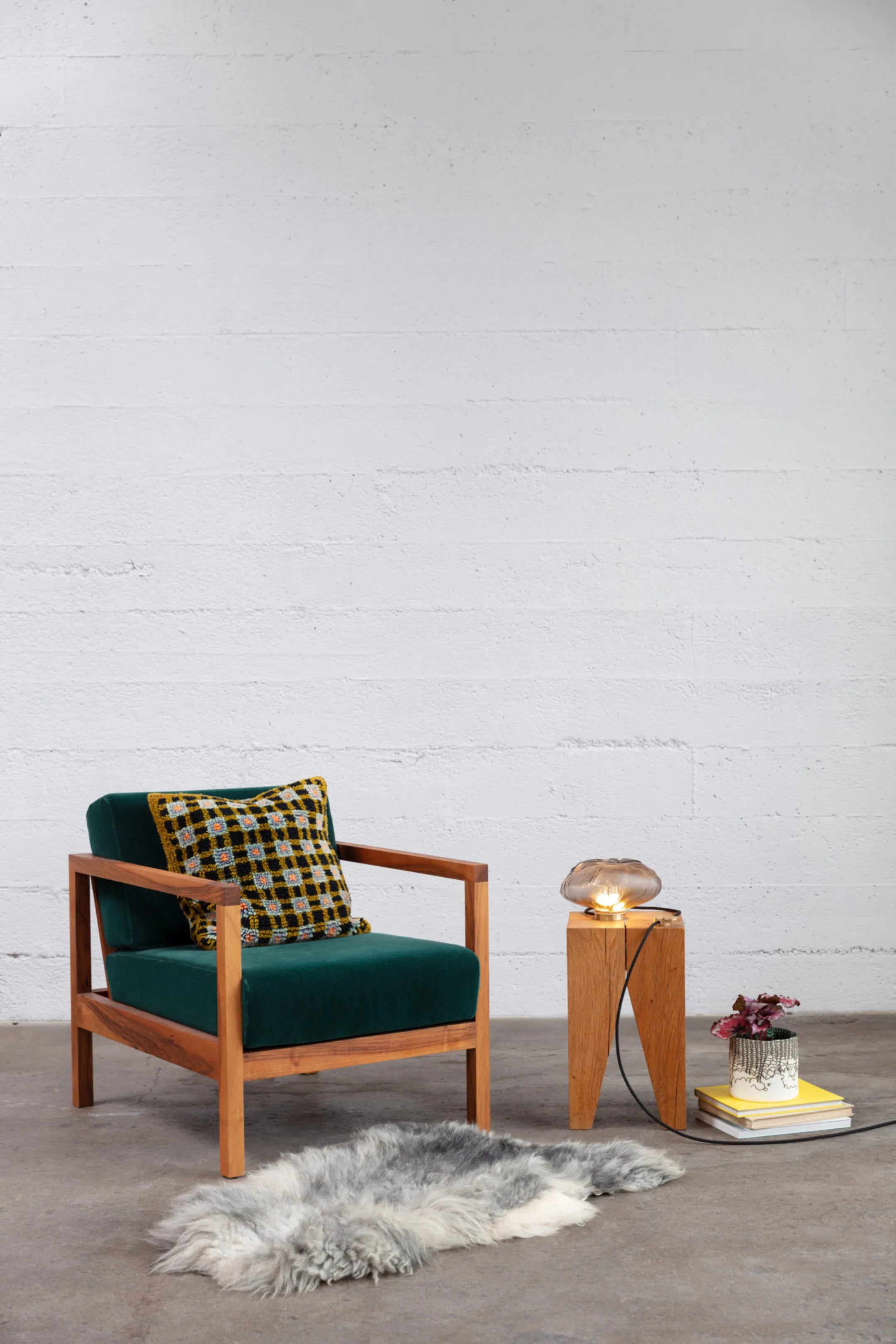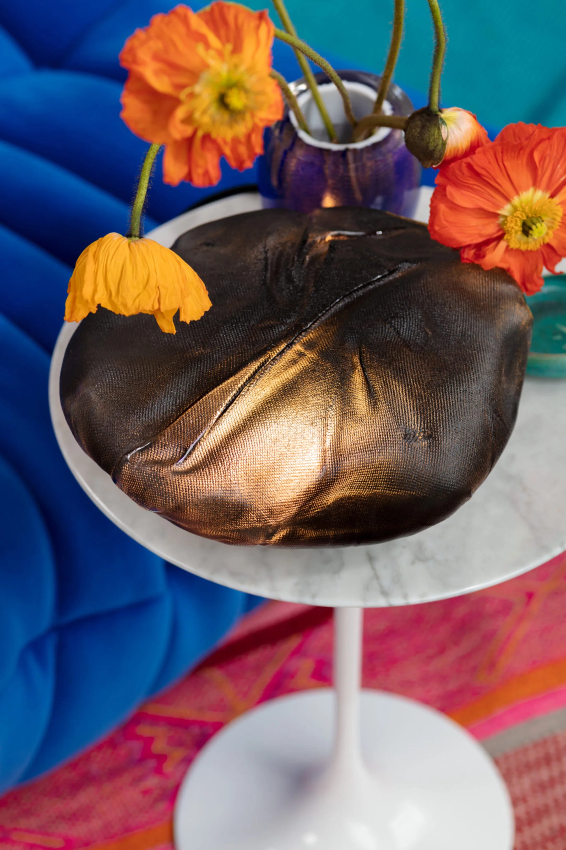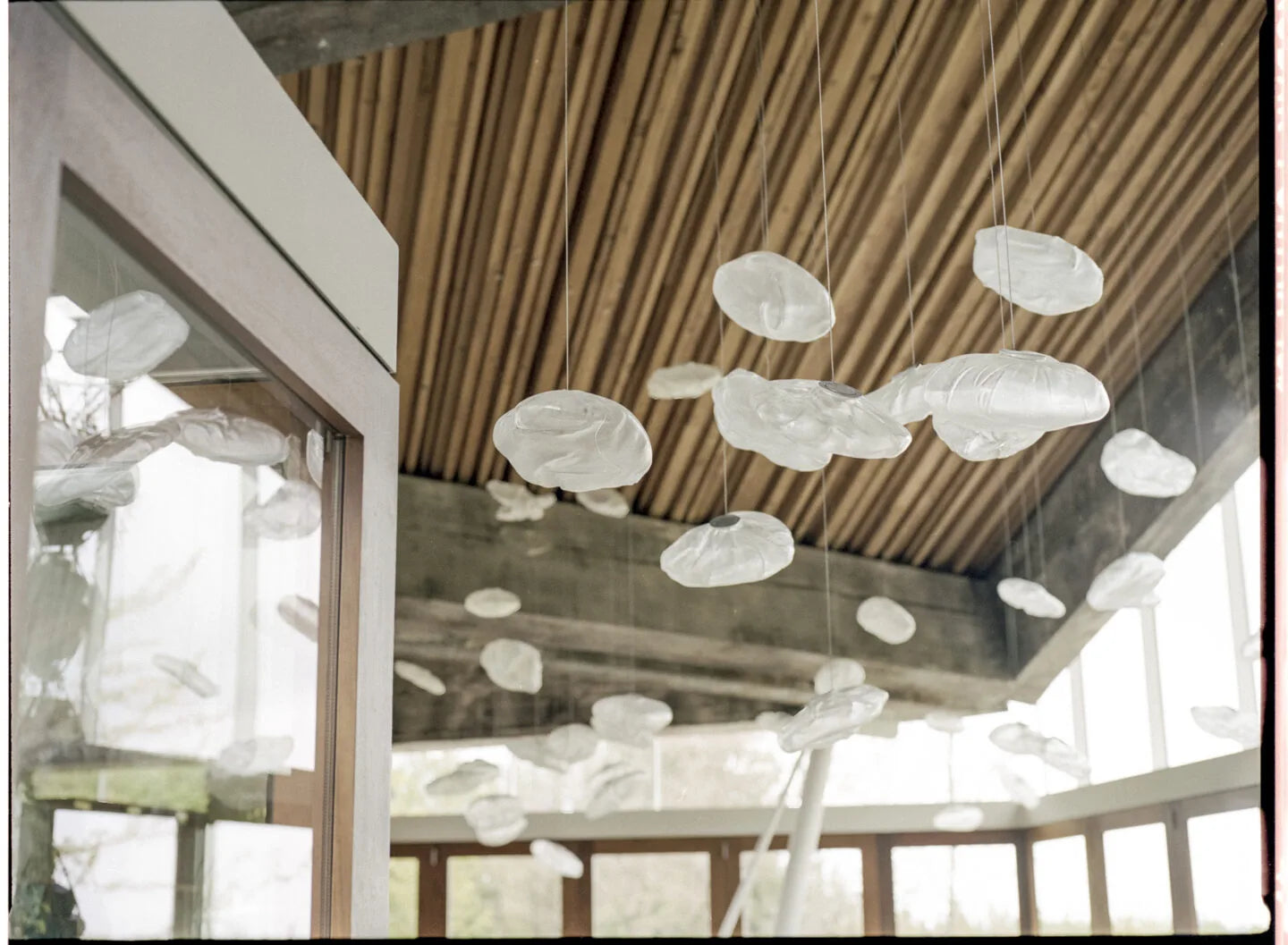 The 73 series inflates molten glass within woven ceramic-infused textile moulds. This process captures intricate patterns and textures from the textiles, producing unique pieces with a diffused glow that enhances the organic, cloud-like forms.